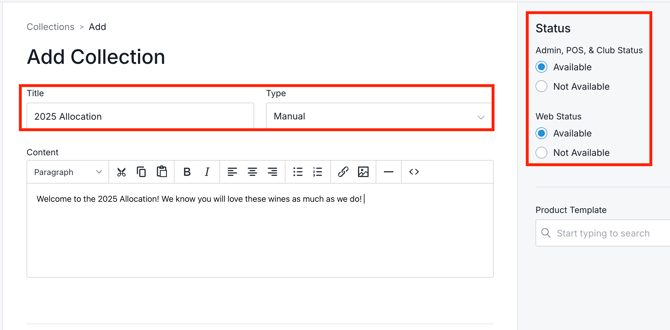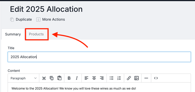 - Content Field (optional): Any text you place in the 'Content' field will appear directly below the Allocation Title on the Allocations page for eligible logged-in Customers. However, it is not enabled by default. Learn how to enable it here.