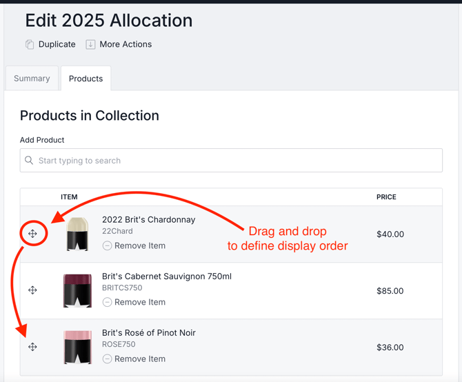 The Products included in the Allocation behave similarly to standard Products as they are organized within designated 'Collections'.