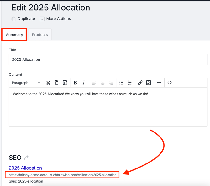 - Scroll down to the SEO section and click on the Collection URL to see it on your website.